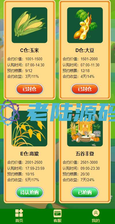 合约价值:100~500RMB,开仓时间:9:00–9:30,预约消耗粮票3/4个,合约收益1天5%